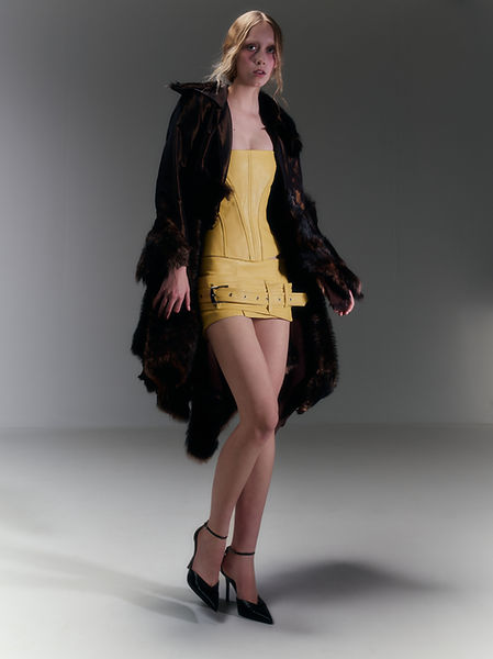 -shock brown taffeta overcoat with dishevelled goat fur -yellow flat busted corset, yellow miniskirt with wraparound double belt with metal hardware