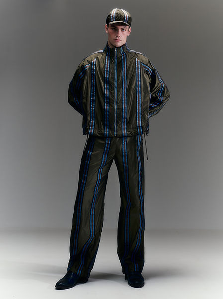 -black structured jacket with exaggerated ruched sleeves, embroidered back, hanging fringe. Paired with low-rise trackie bottoms featuring long fringe detailing down the sides of the legs, ck.